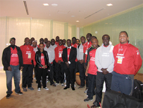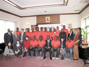 H.E. the Ambassador (center) poses for a group photo with the Kenya national Rugby Sevens team at Hilton Hotel in Tokyo on 31st March, 2012 |