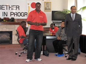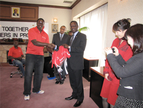 H.E. Ambassador Benson H.O. Ogutu (right) welcomes the Kenya National Rugby Sevens Team to Tokyo, Japan on 31st March, 2012 |