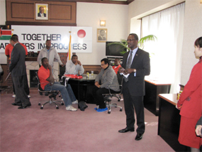 H.E. the Ambassador addresses Kenya Rugby Sevens players during a reception lunch in honour of the Team |