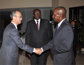 Mr. Karube welcomes Hon. Amos Kimunya EGH, M.P. to reception. Looking on is Amb. Dennis Awori the |