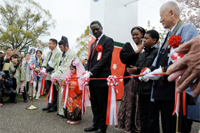 H.E. the Ambassador cutting the tape to launch the parade. With him are Madam Benter A.O. Ogutu to his right, and Mayor Kamiya third to his left |