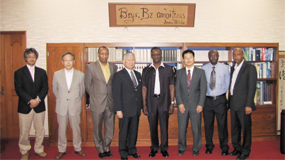 From left to right: Mr. Masani Gomita - Director Office of International Affairs; Prof. Takeo Hondoh-Vice President; Mr. Paul K. Ndung'u-Kenya Embassy; Prof. Hiroshi Saeki-President of Hokkaido University; H.E. Amb. Benson H.O. Ogutu; Prof. Masahiro Okumura-Director of Hokkaido University, Lusaka Office; Mr. John Nduko-Student; Mr. Mathew Kaikai – Kenya Embassy on 26th June, 2012 |
