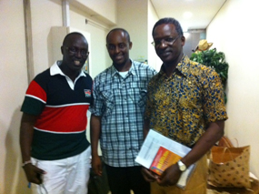 ![]() From right to left, H.E. Benson H.O. Ogutu, Mr. Jones a Tanzanian journalist with NHK Japan and Mr. Gideon a Kenyan journalist with NHK Japan |