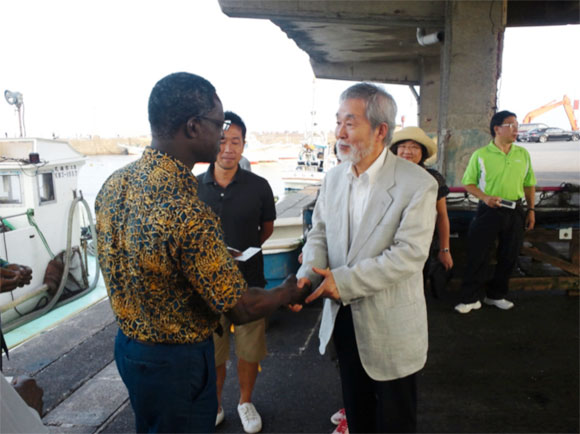 Amb. Ben Ogutu (left) being met at Oiso Port by the town's Mayor, Mr. Hisao Nakazaki