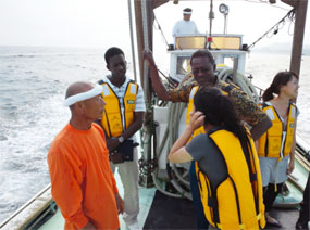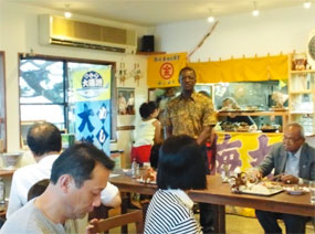 ![]() His Excellency the Ambassador being briefed by Mr. Teruo Shigeta, Chairman, Oiso Chamber of Commerce and Industry on the fishing industry in Oiso Town at the start of a tour of the fisheries region aboard a fishing boat and inspect the fishing boat's fish storage space, actual fixed fishing net and fishing method demonstration by the members of Oiso Fishery Cooperative. | ![]() Amb. Ogutu is seen above making a speech during a reception at Oiso. |
