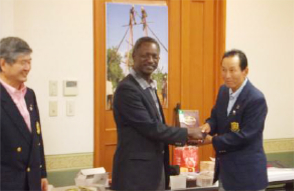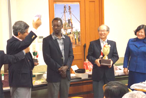 H.E. Ambassador Benson Ogutu awarding the 1st Prize Winner's Cup to Mr. Katsuhiko Arizumi from Rotary Club of Tokyo Marine