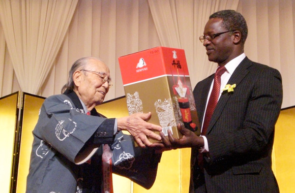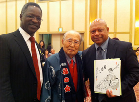 (from left) Mr. Watanabe, President of Fukuno-kai, Ambassador Benson H. O. Ogutu and Mr. Miyake, President of Sempuku |