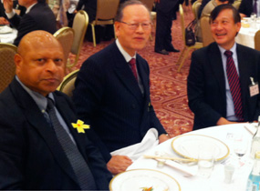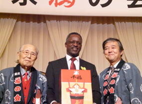 H.E. the Ambassador with Mr. Watanabe, President of Tokyo Fukuno-kai (centre) and Deputy Ambassador Mr. Denis Bebego (right) |
