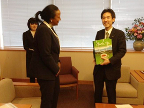 ![]() Amb. Amina and Hon. Taira exchange gifts after the meeting |