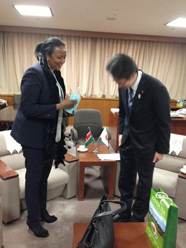 ![]() Amb. Amina and Hon. Kiuchi exchange gifts after the meeting |
