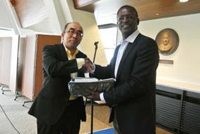 Amb. Ogutu presents a prize to Mr. Kazunori Sato; Oriental Yeast |