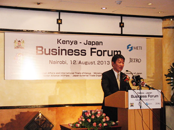 Hon. Toshimitsu Motegi, makes opening remarks at the Kenya-Japan Business Forum on 12th August, 2013 in Nairobi