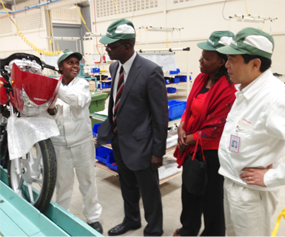 Amb. Ogutu, the Kenyan Ambassador to Japan, being taken through the assembly process by Prudence Maseki of Honda Motorcycle Kenya Ltd, during a tour of the Motorcycle assembly plant in Kenya. Looking on is Mrs. Ogutu (Centre) and MD. Yasuhiro Imazato. |