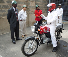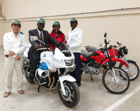 ![]() Amb. Ogutu, the Kenyan Ambassador to Japan, testing the CB1300 Police bike at Honda Motorcycle Kenya Ltd, during a tour of the Motorcycle assembly plant in Kenya. Looking on is MD. Yasuhiro Imazato, Mrs. Ogutu and HMK Chairman Dr. Isaac Kalua. |