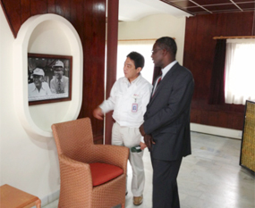 ![]() Amb. Ogutu, the Kenyan Ambassador to Japan, being shown the Portrait of Honda founders Mr. Saichiro Honda & Mr. Takeo Fujisawa by MD. Yasuhiro Imazato, at Honda Motorcycle Kenya Ltd, during a tour of the Motorcycle assembly plant in Kenya. |