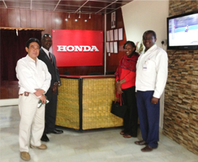 ![]() Amb. Ogutu, the Kenyan Ambassador to Japan, MD. Yasuhiro Imazato, Chairman Dr. Isaac Kalua and Mrs. Ogutu at the reception of Honda Motorcycle Kenya Ltd, during a tour of the Motorcycle assembly plant in Kenya. |