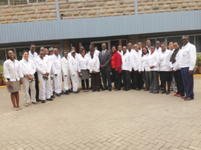 ![]() Amb. Ogutu, the Kenyan Ambassador to Japan and Mrs. Ogutu, with Honda Motorcycle Kenya Ltd Associates, during a tour of the Motorcycle assembly plant in Kenya. |