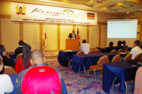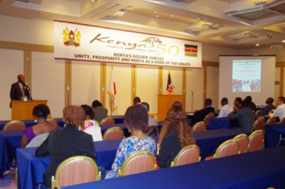 Kenyans in Japan celebrated 50 years of independence in a colourful ceremony that was held at Shinagawa Prince Hotel in Tokyo on 14th December, 2013. The event, which was organized by the Embassy in collaboration with a Committee of Kenyans in Japan Association – KIJA, was attended by more than a hundred Kenyans from various regions in Japan. The first segment of the event was dedicated to a Diaspora Symposium while the second segment was utilized for the Kenya @50 celebrations. H.E. Mr. Benson Ogutu, Kenya's Ambassador to Japan, graced the occasion.