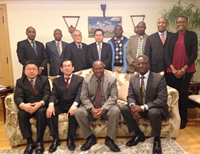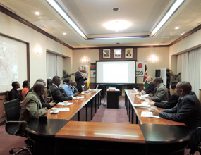 Seated from right to left: H.E. Mr. Ogutu, the Ambassador, Mr. Lopoyetum, the Principal Secretary; Mr. Masayoshi Takeuchi, Chairman and CEO of NJS Consultant Co. Ltd; and Mr. Fujiwara Hiroki, President of NJS Consultant Co. Ltd. 21st January, 2014. |