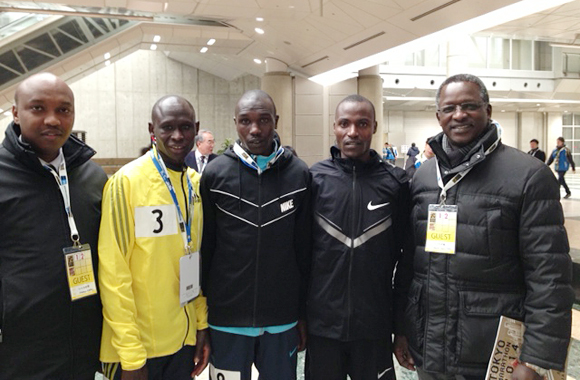 From R-L: H.E. Mr. Benson Ogutu, Kenya's Ambassador to Japan; Mr. Dickson Chumba, winner of Tokyo Marathon; Mr. Geoffrey Kipsang, 6th in the race; Mr. Michael Kipyegon, 4th in the race; and Mr. Mathew Kaikai, First Secreatry at Kenya Embassy, pose for photo after the Marathon on 23rd February 2014.