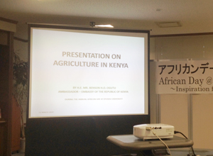 During the event, the Ambassador gave a presentation on agriculture in Kenya, focusing on diverse sectors of agriculture, its challenges and Government's policies in transforming agriculture into profitable, commercially oriented, internationally and regionally competitive economic activity. The event was also attended by the Ambassador of Nigeria to Japan, H.E. Mr. Godwin Agbo, who gave a presentation on Nigeria's role in peace keeping in Africa.