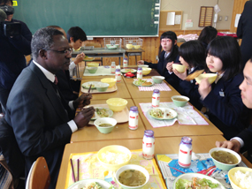 H.E. the Ambassador Ogutu share the lunch time with students at Hachimori Junior High school |