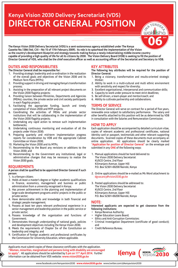 JOB ADVERT FOR DIRECTOR GENERAL POSTION AT KENYA VISION 2030 DELIVERY SECRETARIAT (VDS)