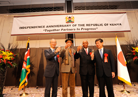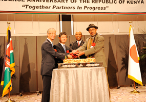 L-R- Honorary Consul, Mr. Jun Karube; H.E. Amb.Estifanos Haile, Ambassador of Eritrea in Japan & Dean of the African Diplomatic Corps; Deputy Head of Mission, Mr. Paul Ndung'u; and Guest of Honour ,H.E. Amb. Hiroyasu Kobayashi, toast and cut the cake to mark the 51st Kenya's Independence anniversary |