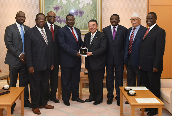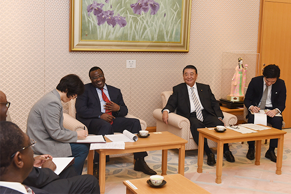 On Wednesday, 1st July 2015, the Kenyan Senate Speaker Hon. David Ekwee Ethuro and his delegation paid a courtesy call on the Speaker of the House of Representatives, Hon. Tadamori Oshima. The Japanese Speaker Hon. Oshima graciously welcomed the Speaker and his delegation to Japan. He went on to explain that the government of Japan features a three-way separation of powers giving legislative powers to the Diet, executive powers to the cabinet, and judicial powers to the judiciary for checks and balances to guarantee the people's rights and freedoms.