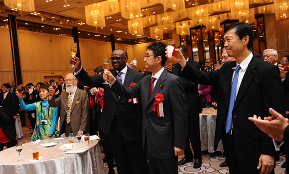 (Left –Right) H.E Amb. S. K. Maina; Hon. Katsuyuki Kawai - Special Advisor to the Prime Minister of Japan(Chief Guest), and Mr. Norio Maruyama - Director General (Amb.), African Affairs Department, Ministry of Foreign Affairs of Japan toast the opening of the reception