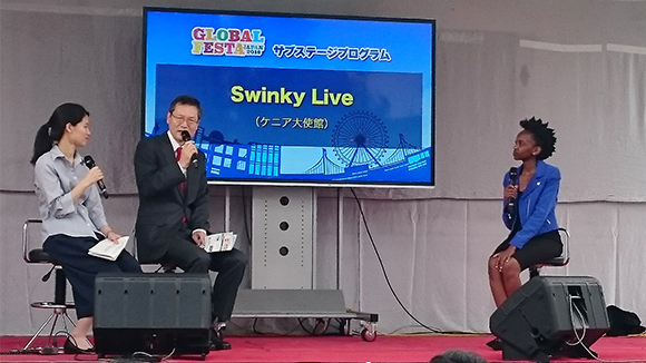 Kenyan Japan-based Musician, Esther Thirimu aka Swinky being interviewed by Amb. Junzo Fujita, Ambassador for TICAD at Show Arena
