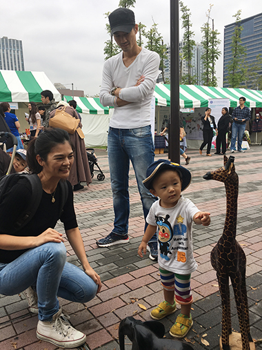 A young show goer admiring a giraffe carving at Kenya Embassy booth
