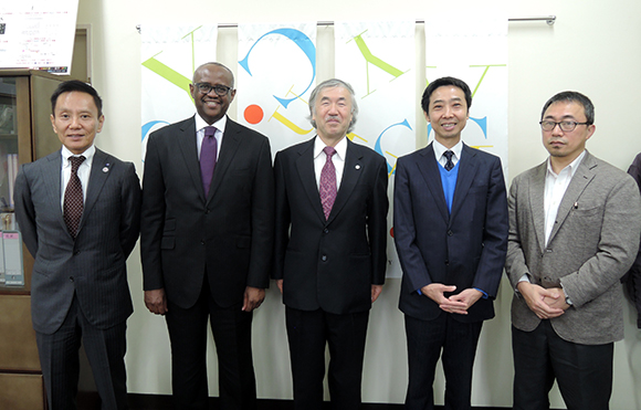 (L-R): Mr. Makoto SEKIYAMA, Director General of International Affairs Bureau, City of Yokohama; H.E. Amb. S.K. MAINA; Prof. Yoshinobu KUBOTA, President of Yokohama City University; Prof. Takehiko UEMURA, International College of Arts and Sciences, Division of Global Urban and Regional Studies, Global Cooperation and Area Studies; Associate Prof. Eiichi YOSHIDA, International College of Arts and Sciences, Division of Global Urban and Regional Studies, Global Cooperation and Area Studies