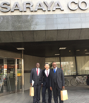 H.E. the Ambassador, Mr. Saraya, the President and Mr. Paul M. Kaliih, Minister-Counsellor in front of Saraya HQs offices, Osaka. |