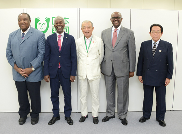 From left, Dr. Milanga Mwanatambwe, M.D. PhD, Advior Tokushukai General Incorporated Association, H.E. Mr. Ahmed ARAÏTA ALI, Ambassador of Djibouti, Mr. Yohei Sasakawa, Chairman of Nippon Foundation, H.E. Mr. S.K. Maina, M.B.S.,Ambassador of Kenya, and Professor Masanori Nogi.