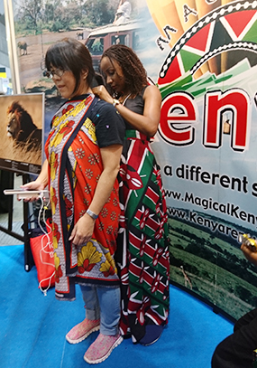 Ms. Maangi helping a Japanese national dress in a Maasai outfit at the Kenya Embassy Pavilion |