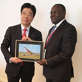 Dr. Cleopa Mailu, E.G.H. presents a gift to Japanese Counterpart, Hon. Katsunobu Kato after their bilateral meeting on the sidelines of UHC Forum. |