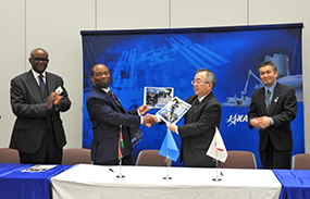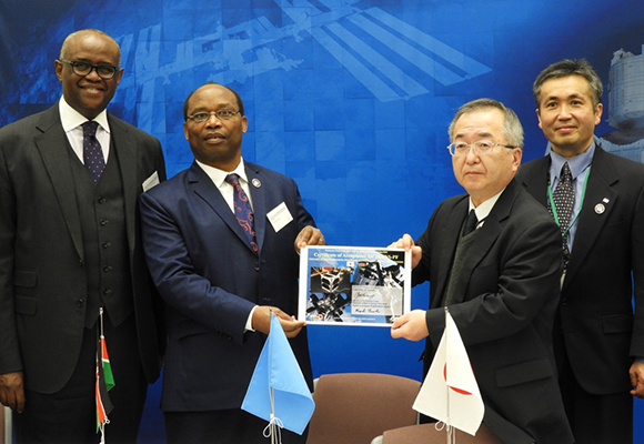 to Prof. Jackson M. Mbuthia, University of Nairobi, and H.E. the Ambassador on the left and Dr. Koichi Wakata on the right.