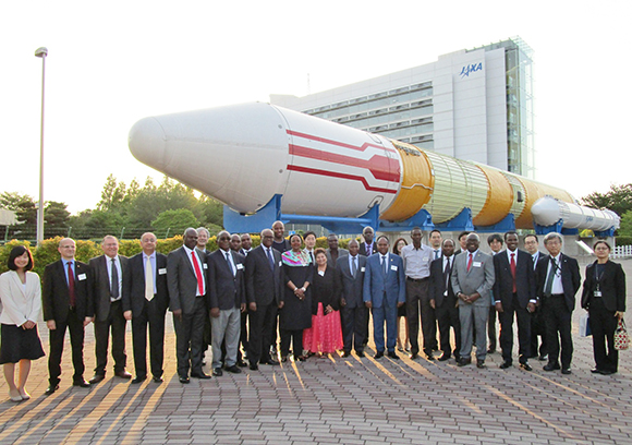 Group Photo in front of a JAXA Space Rocket