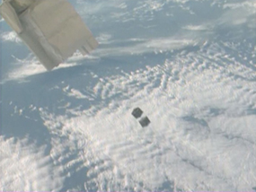 The 1KUNS-PF being deployed from the Robotic arm of the International Space Station