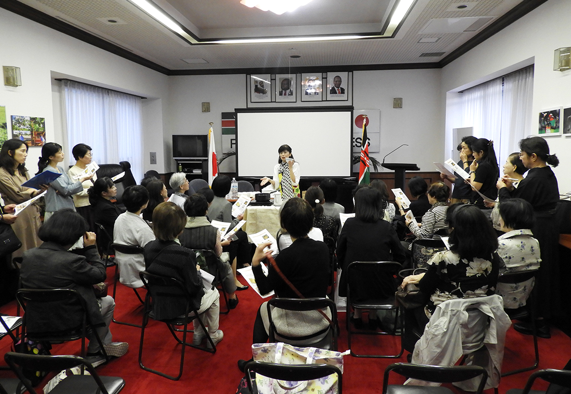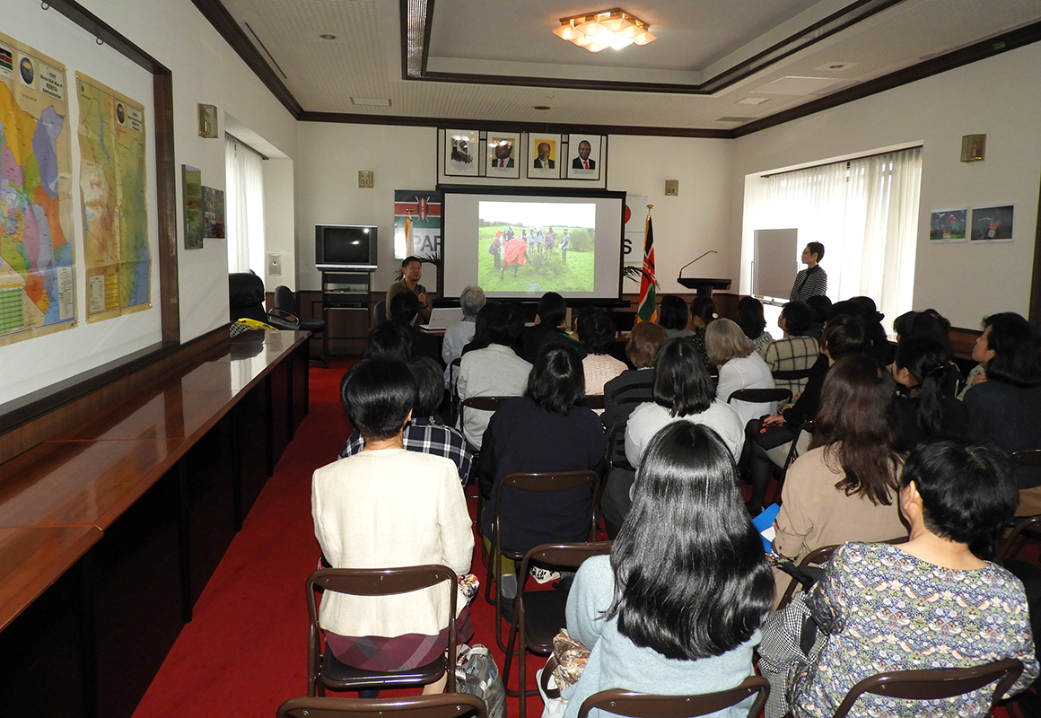 The seminar started off with welcome remarks and introduction of Kenya by Mrs. Lucy Njihia for 20 minutes. It was followed by tourism lecture conducted by Mr. Naokuni Kato who is a Kenyan professional tour guide. Lastly the visitors were taken through tea making lesson by Ms. Masako Oshima.
