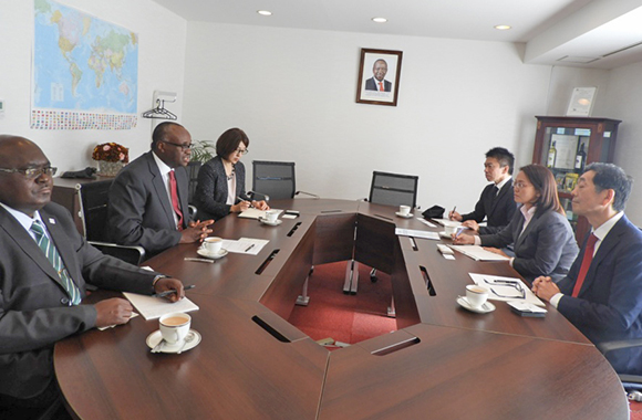 H.E. S.K. Maina, M.B.S(2nd Left), accomapnied by Mr. Paul Kaliih, Minister-Counsellor and Ms. Naoko Yagi, Trade Assistant, duirng the meeting with Amb. Masaya Fujiwara, with Ms. Fukiko Uchida, (Researcher) and Mr.Takashi Yamada, (Researcher).
