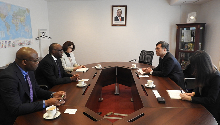 左から: フェスタス・ワングェ公使参事官、マイナ大使閣下、西新所長、堀井優、業務部欧阿中東アジアチーム