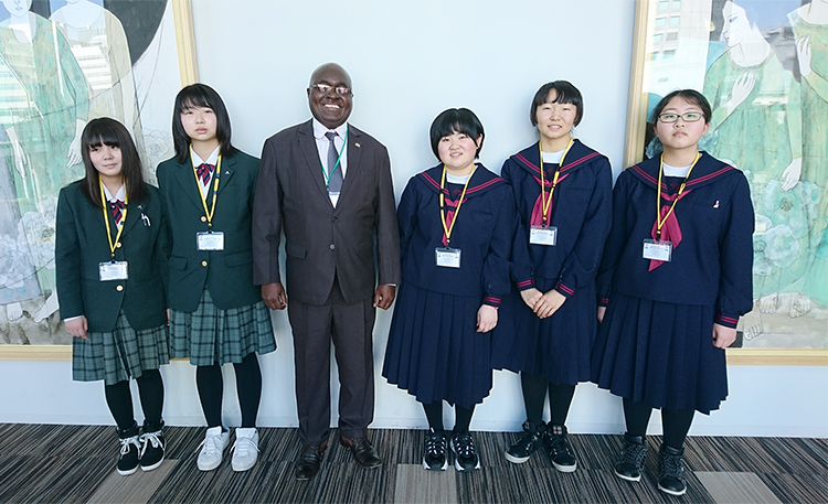 ポール・カリィ公使参事官とホストタウン事業について発表した岩手県石雫の中高生