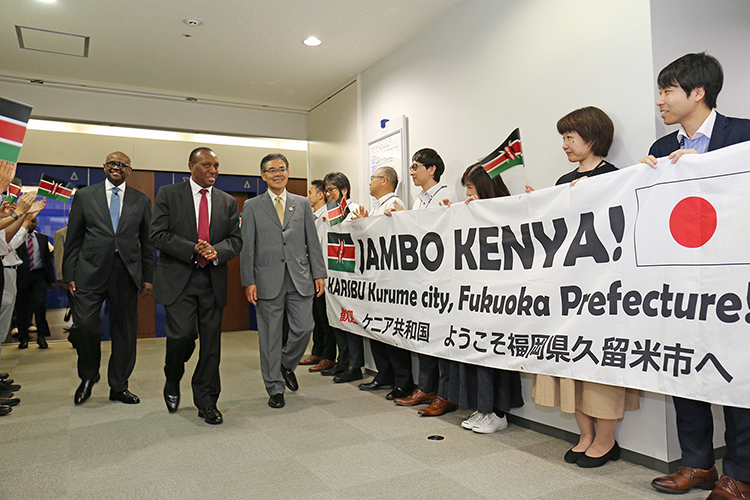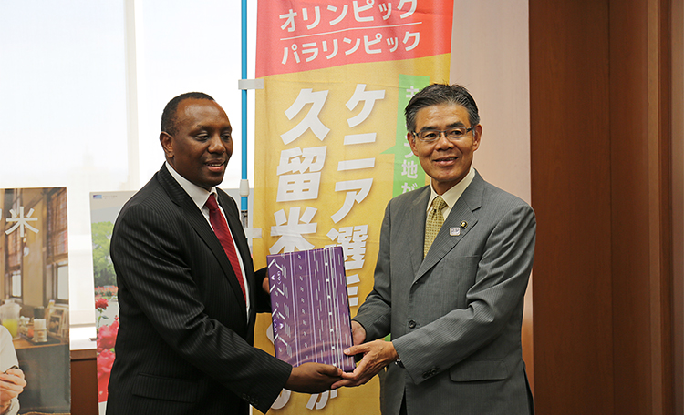 ケニアスポーツ庁次官のピーター・カベリア大使は、S.K.マイナ駐日大使、ケニア陸連代表のジャクソン・トゥウェイ氏、ケニアオリンピック委員会副会長のシャドラック・マルキ氏とともに、2019年5月13−15日久留米市を訪問した。初回に訪問した2017年8月に、久留米市がケニアオリンピック選手事前キャンプ受け入れ地とすることを正式に決定し、覚え書きに署名した。今回はその内容をフォローアップする目的で訪問し、トレーニング施設と宿泊施設を見学した。さらに、新たに着任した大久保勉久留米市長を表敬し、また久留米市商工会議所会頭の本村泰人氏と面会した。