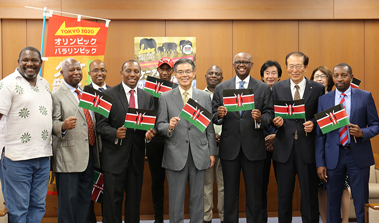 左から、シャドラック・マルキ氏(ケニアオリンピック協会副会長)、ジャクソン・トゥエイ氏(ケニア陸連会長)、ジョージ・ジョロゲ氏(スポーツ庁長官秘書)、ピーター・カベリア大使(スポーツ庁次官)、ダグラス・ワキフリ氏、大久保勉氏(久留米市市長)、マイナ大使閣下、廣谷和信氏、永田一伸氏(久留米市議会議長)、八木尚子氏、フランシス・ムトゥク氏(ケニアオリンピック協会会長代理)