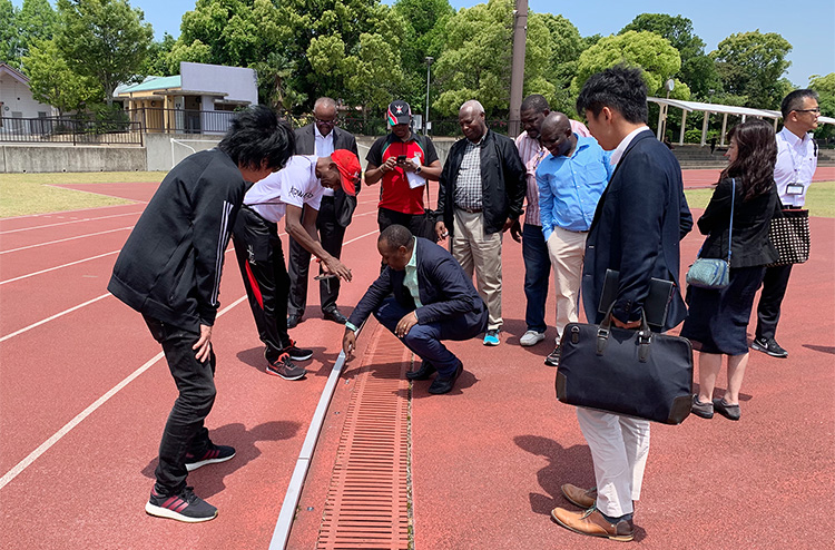 陸上トラックのコンディションをチェックする次官と視察チーム