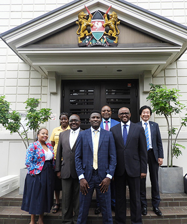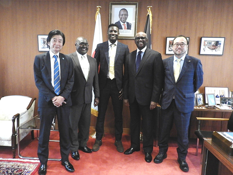 左から:廣谷和信氏、ポール・カリイ公使参事官、マイケル・オルンガ氏、S.K.マイナ大使閣下、エドソン・マサヨシ・早川氏