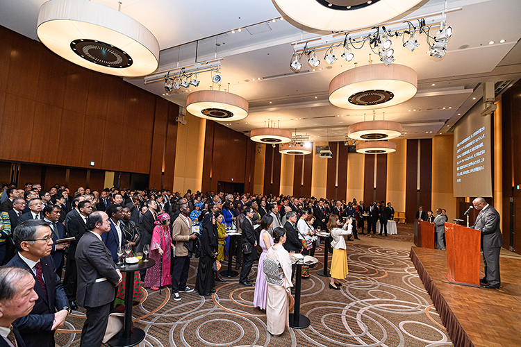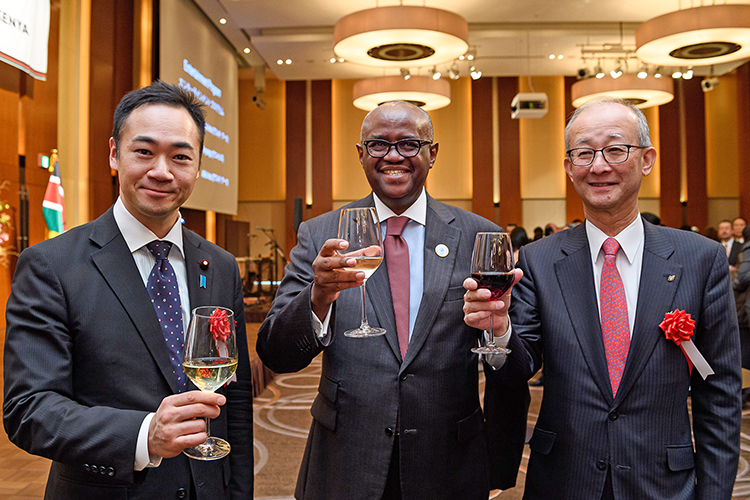 (左から右):外務副大臣 鈴木馨祐氏、S.K.マイナ大使、豊田通商会長/ケニア名誉総領事 加留部淳氏が独立記念式典にて乾杯
