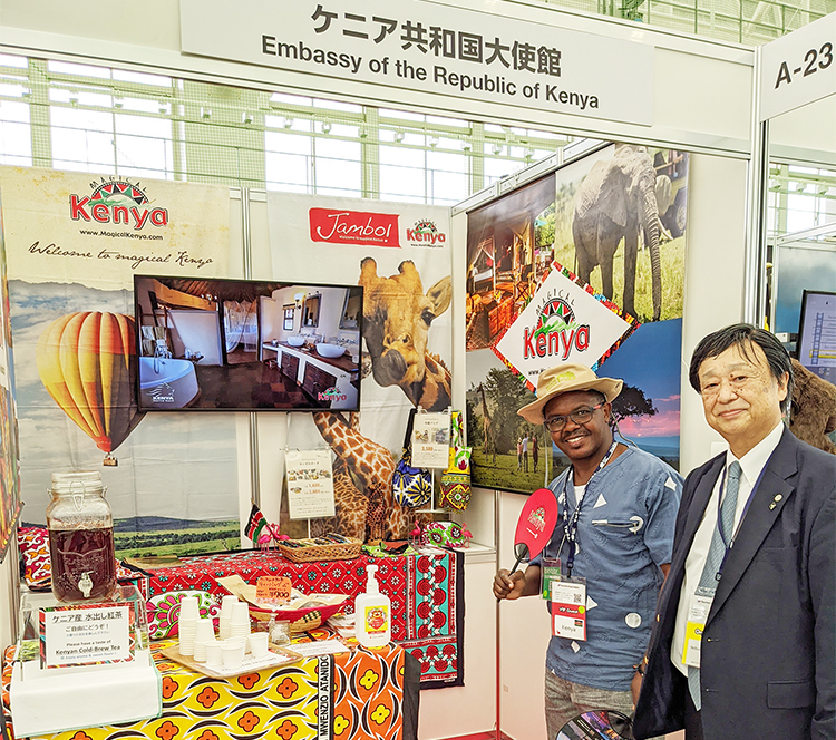 日本旅行業協会 坂巻伸昭会長とケニア大使館ブースでポーズするアンソニー・ンジョロゲ二等参事官